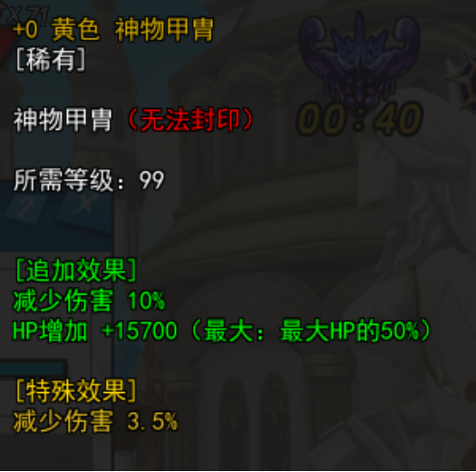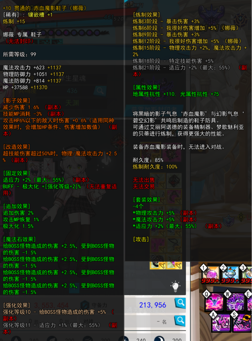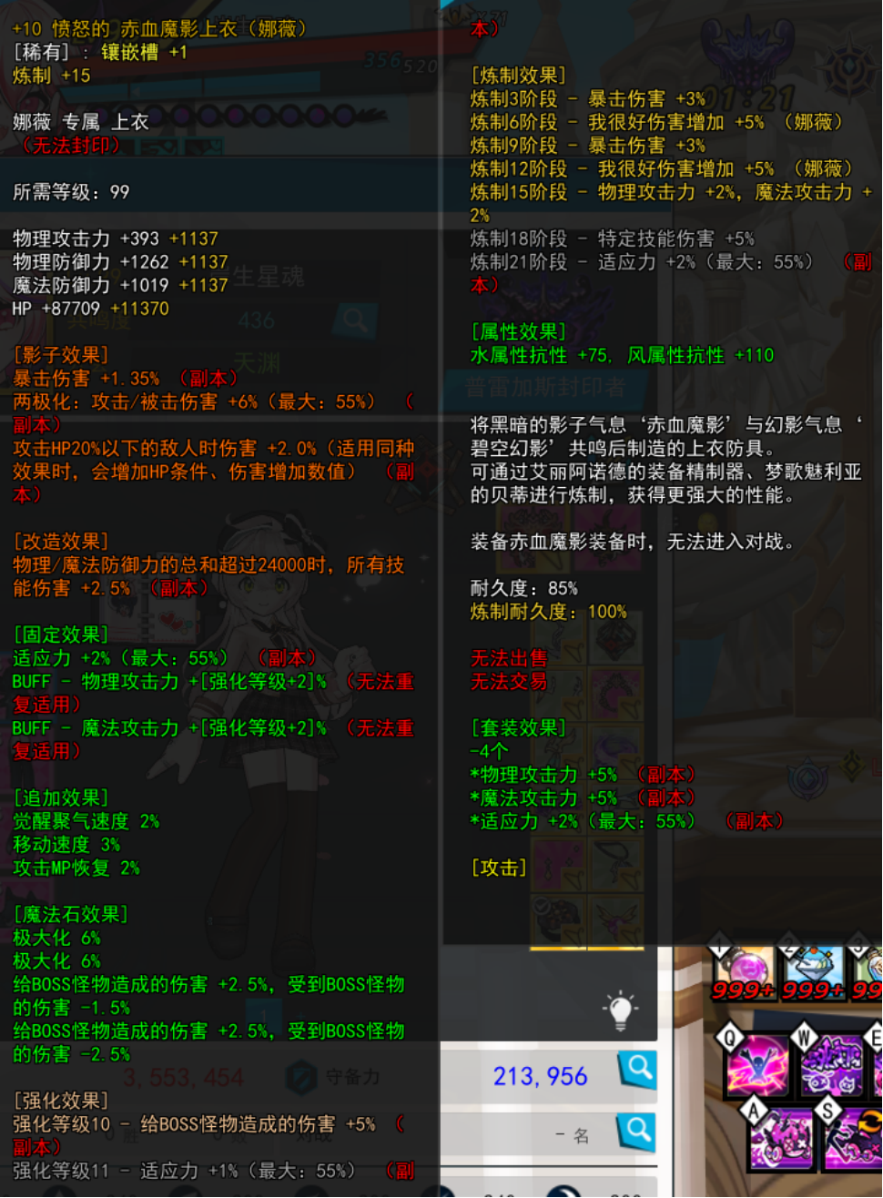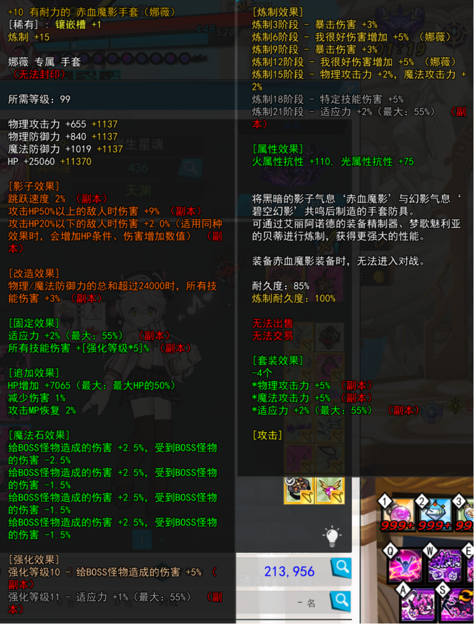 防具:+10、炼制15的赤血魔影防具,使用季卡赠送的六张满值自选分别赋予上衣二词条攻被、手套二词条强者以及四件防具的三词条血线(不知道血线词条的请自行查阅图书馆首页必看内容),使用活动开始两周后每周赠送的两个80%词条赋予一词条四件防具技伤、下衣二词条减伤/组队减伤/组队hp、鞋子二词条组队队员动作速度/组队队员移动速度/减耗。