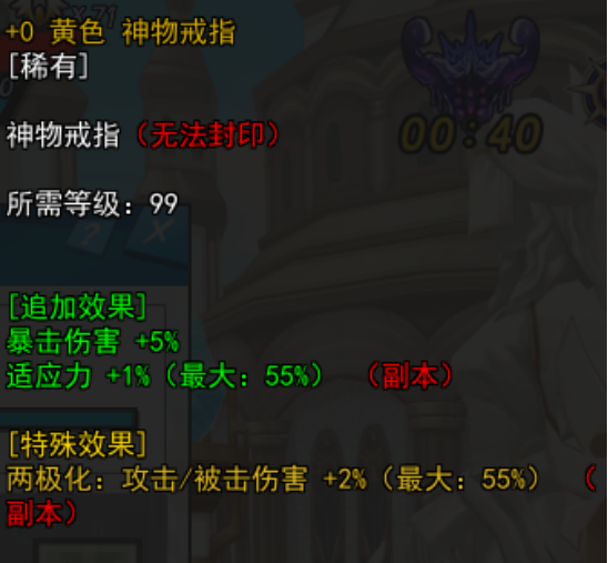 选择打造一套黄色神物,其中两个神物戒指选择季卡提供的自选神物精灵石箱子选择两个黄色、两极化属性。