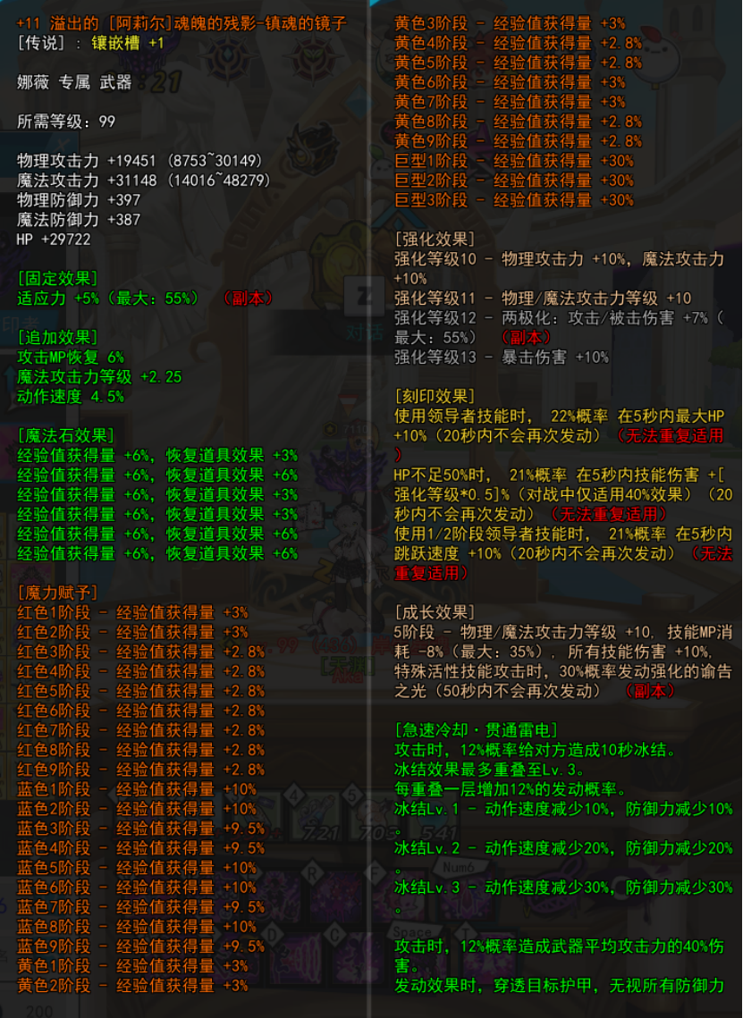 武器:选择活动赠送的+11镇魂武器(满阶段,需自己打建议在三倍牌子内一天打完,或等待两周后每周赠送一个一天期限的三倍牌子),在保证自己能进15r团本(150w*0.95战力=142.5w)的前提下,魔力石全部选择经验值,魔法石选择发光的成长魔法石,刻印可以考虑全洗暴击凑战力(战力不够的前提),也可以按照正常输出洗。
