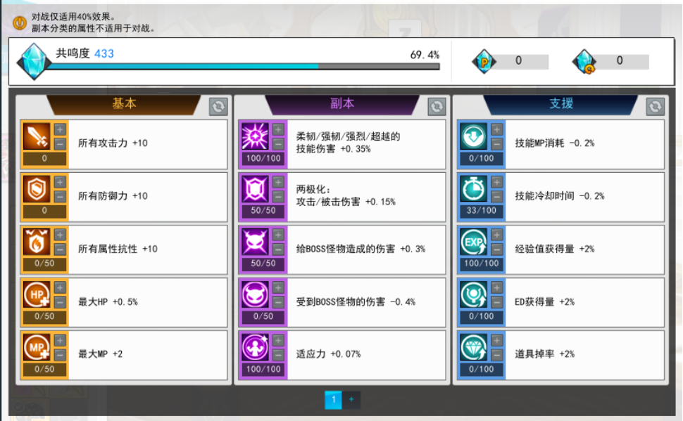 共鸣:作者个人建议在建号时就按照62的配置点好,即经验-技伤-适应力-攻被-cd-ed等其他,(注:不推荐点王伤;下面的共鸣参考图请把王伤自行分配给cd/ed等;由此带来的战力不足问题本文不予考虑)从而省下99级的