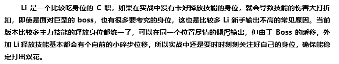 Li自身循环的手法都是我自己蘑菇房和实战研究了很久总结出来的,也很感谢许多Li的同好(茶哥、小饼、镜音Len......)和我一起讨论。这套流程是目前我习惯比较流畅且稳定的高输出手法,但是每个人习惯和打法不同,如果有更合适的循环打法,请指教望轻喷。
