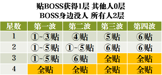 叠层的特点是,如果Boss身边没人,就所有人叠两层,如果Boss身边有人,边上的人叠一层,其他人不叠层。