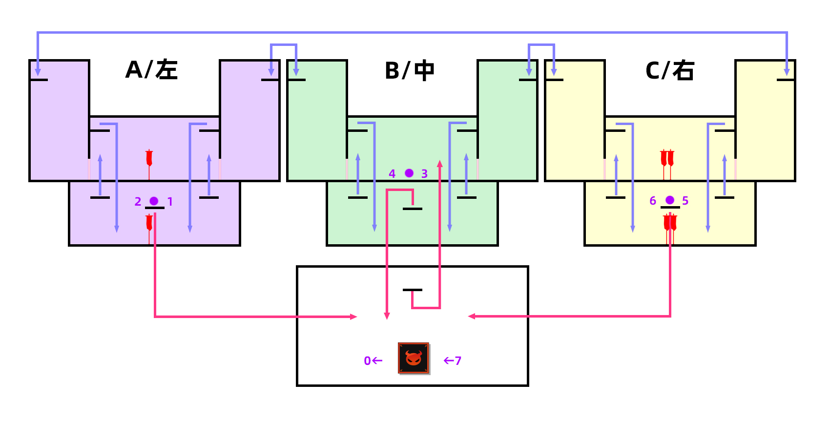 250730更新补丁:左边房间中间紫色标记,中间房间中间绿色标记,右边房间中间黄色标记,可以根据标记颜色区分不同房间。