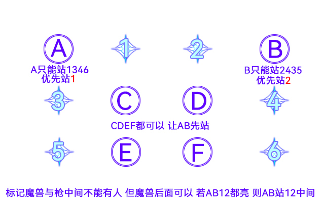 机制开始时可以按Delete确定星标魔兽位置,由于左上角跟右上角的标枪能锁的范围更小,优先让他们选魔兽(比如出256,A只能站对角6)。